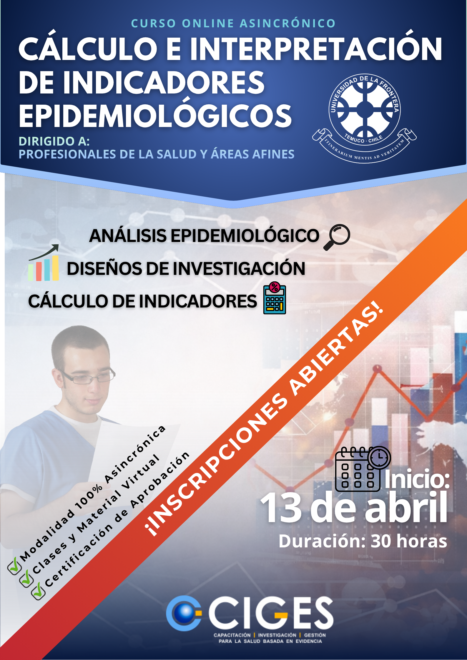 Este curso entrega herramientas fundamentales para el cálculo, interpretación y aplicación de indicadores epidemiológicos, junto con una introducción a los principales diseños de estudios epidemiológicos, fortaleciendo la capacidad de los profesionales de la salud para interpretar literatura científica y tomar decisiones basadas en evidencia.